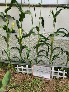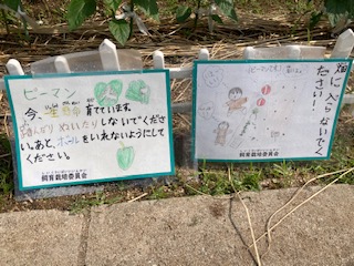 ミニトマトやピーマン、とうもろこしの苗が大きく育ってきています。手作りの看板に思いがこもっています。