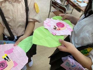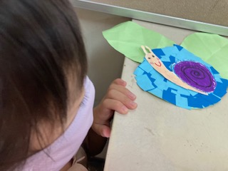 カタツムリの絵を描いて切り抜き、自分が作ったアジサイにちょんとのせました。かわいらしい6月の絵が出来ました。