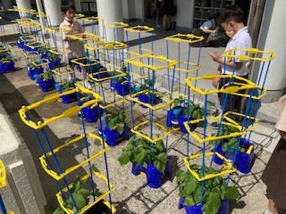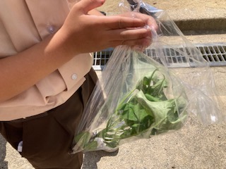 アサガオが大きく育ってきたので、間引きをしました。太くて本葉がたくさんある苗を選んで残しました。間引いたなえは、家に持って帰りました。