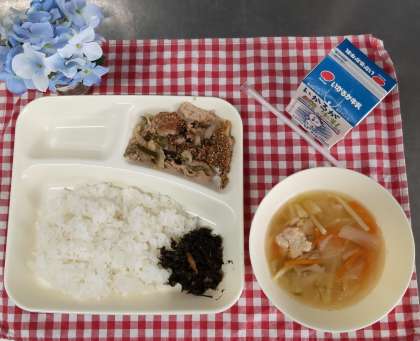 今日は豚肉のごまみそ焼き、すまし汁、のりのつくだ煮、ご飯、牛乳でした。佃煮(つくだに)も給食室の手作りです。出来立ては海苔の香りがしてご飯も進みました。
