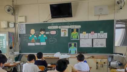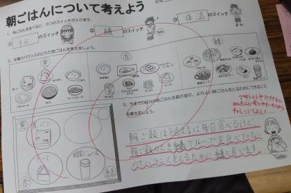 6年生で「朝ごはんについて考えよう」の学習をしました。朝ごはんを食べると3つの良いスイッチが入ります。自分の朝ごはんを振り返りながら、もっと良くするにはどうすれば良いか考えました。