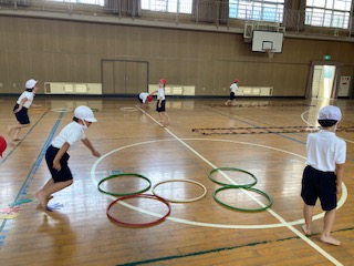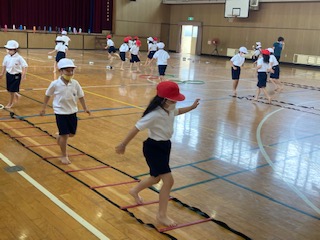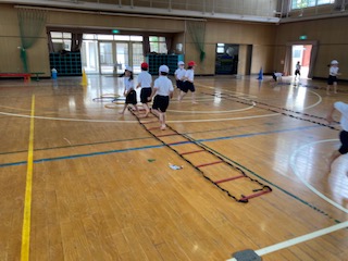 ラダーやフラフープを組み合わせて、走ったり跳んだりしました。動画の組み合わせも自分達で考えています。