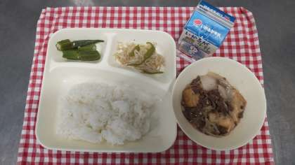 今日はすき焼き煮、オクラのかつお梅風味、もやしとピーマンのごまいため、ご飯、牛乳でした。白菜ではなく玉葱を使ったすき焼き煮も甘味があり好評でしたよ。
