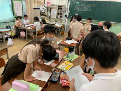 社会科の時間に、大阪市の給水量について資料からどんなことが言えるのかグループで相談しました。