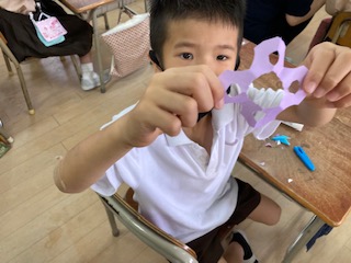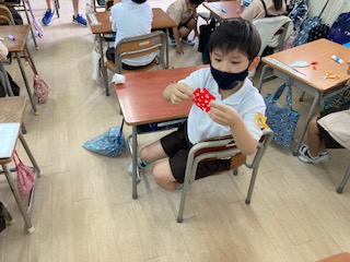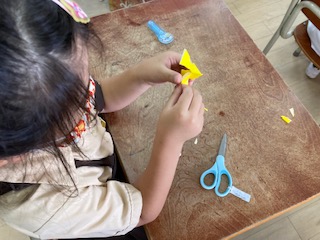 折り紙をいくつかに折って、ハサミで切り込みなどを入れて、七夕の飾りを作りました。