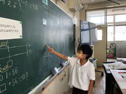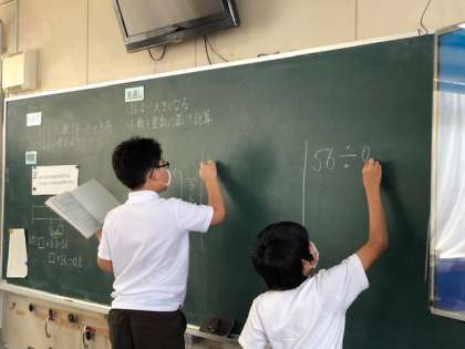 わる数が1より小さいときの商の大きさはどうなるのか、答えや解き方の見通しを出し合ってから自分でノートに考えを書き出しました。小数を整数に直すことで、筆算を使わずに答えを導く方法に気づくことができました。