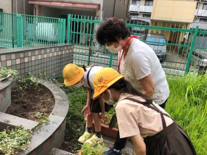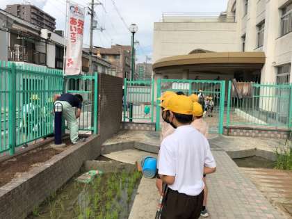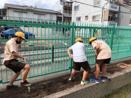 5年生の有志の子どもが、管理作業員さんと一緒にビオトープの土を混ぜ、花の植え替えをしました。大きなシャベルも使い方を覚えると上手に使いこなしていました。大宮小学校をよりよい学校にするため、高学年として主体的に活動しています。