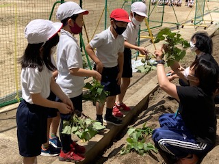 学習園にうねをつくり、サツマイモの苗を植えました。国語科てで学習したことを、実際に生かす場です。何のためにうねを高くするのか、苗はどんなものが良いのか考えて植えました。