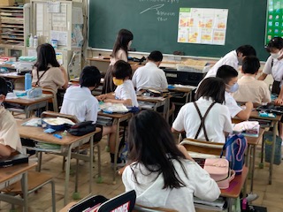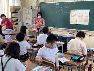 ボタンの付け方を学習しました。できた子は、まわりの子の応援もして、皆つけることができました。これで標準服のボタンが取れても自分でつけることができますね。