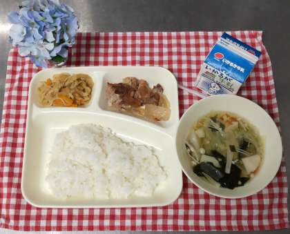 今日は豚肉の甘辛焼き、すまし汁、切り干し大根の炒め煮、ご飯、牛乳でした。切り干し大根は生の大根と比べると食物せんい、カルシウム、鉄が多くなります。家庭で使う機会が減っていますが、常備菜にもなる便利な食材ですよ。