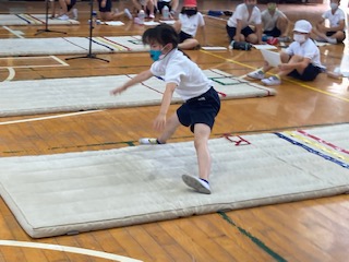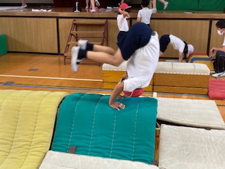頭跳ね飛び、開脚前転、開脚後転などスモールステップで城田担目指します。マットでは、タブレットに自分の動きを録画して点検しています。