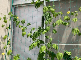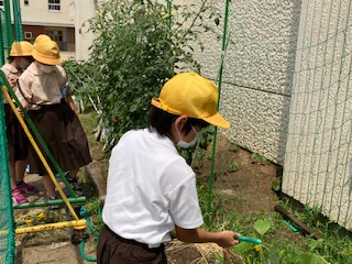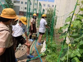 毎朝当番が野菜の水やりをしています。ゴーヤも大きくなってきました!