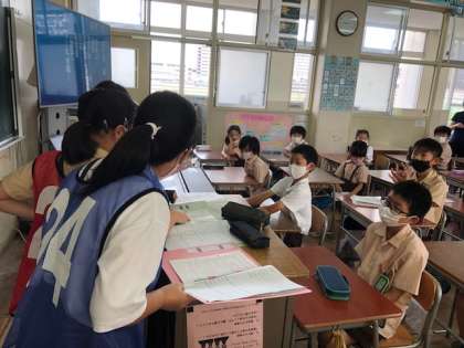 ハッピータイムの班編成を各教室で行い、自己紹介と6年が考えたミニゲームを行いました。昨年度は一度も実施できなかったたてわり班活動。初めての司会に緊張しながらも、6年は自分の班の下の学年のことをしっかりとフォローしていました。