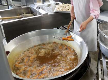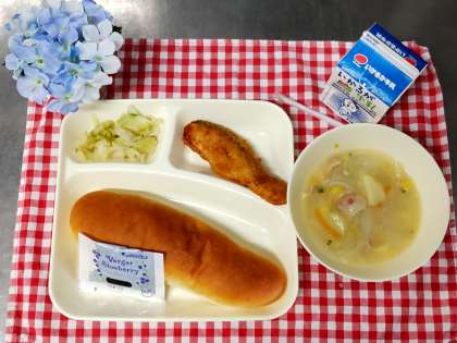 今日はサーモンフライ、豆乳スープ、キャベツのソテー、コッペパン、ブルーベリージャム、牛乳でした。サーモンフライは給食室で崩れないように丁寧に揚げてくれました。マイルドな味の豆乳スープは乳アレルギーのある子も食べることができます。