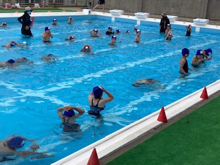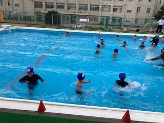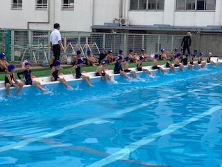 小学校に入って初めての大きなプールでの水泳学習です。音楽に合わせて準備体操をした後、シャワーや入り方の練習などをしました。プールサイドには目印を置いて、距離が近くならないようにしています。