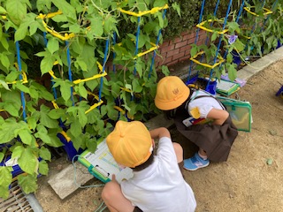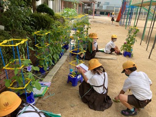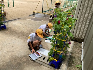 アサガオを観察して気づいた事をカードに記入しました。毎日、たくさん花が咲いています。つぼみもいっぱいついています。