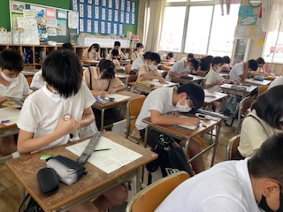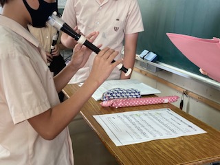 リコーダーのテストをしました。待っている間は、復習プリントを。リコーダーの先に透明の太いパイプをつけることで、マスクをしたまま吹いても音が出るようにしています。