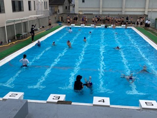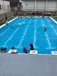 水泳学習の2時間目、コース別でどんどん練習をしました。見学者は、多目的室で水泳の動画を視聴して気づいたことをまとめたり、2階から友達の泳ぎを見て感想を書いたりしました。