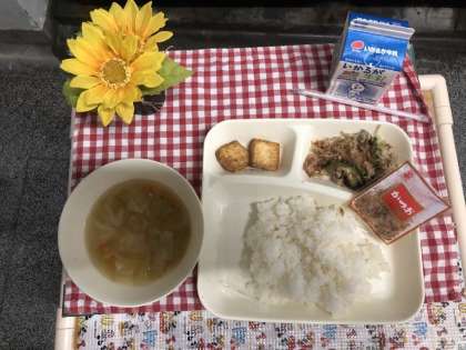 今日はゴーヤチャンプルー、すまし汁、あつあげのしょうがじょうゆかけ、ごはん、牛乳でした。ゴーヤにはビタミンCが豊富です。苦味が苦手な人には白いワタの部分をスプーンなどで取り除き、薄く切って調理すると食べやすくなりますよ。