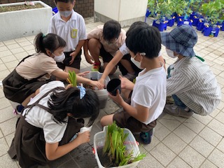 菖蒲の株分けをしました。毎年3年生は、前の年の3年生が育てた菖蒲を引き継ぎ、1年かけて育てて花を咲かせます。