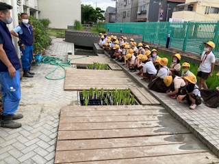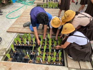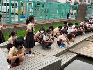 ポットに植えた株をビオトープに運びました。今日の体験を振り返り、「株を切り取ってわかるところからやってみたい」「生命がずっと続いていることがわかって、自分もきれいな花を咲かせたい」などの感想がありました。毎日見に行って、世話をして、美しい花を咲かせてね!