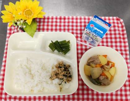 今日は、鶏肉とじゃがいもの煮もの、オクラの梅風味、ツナっ葉いため、ご飯、牛乳でした。梅雨はジメジメして食欲が落ちやすくなります。旬のオクラを梅でさっぱりとした味付けにし、ご飯が進むように栄養たっぷりのおかずになるふりかけを手作りしました。しっかり食べて梅雨も元気に過ごしましょう。