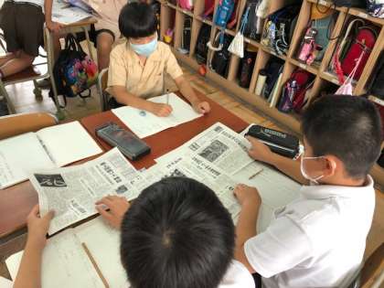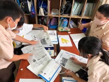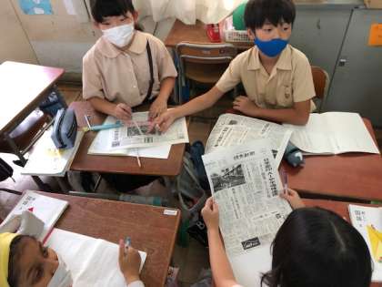 最近では新聞を取らない家庭も増えていますが、今日の朝刊の毎日・読売・産経の一面記事を見比べて、共通点や違いについてグループで話し合いました。写真や見出しの違いなどいろいろな気づきがありました。