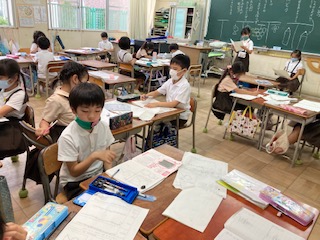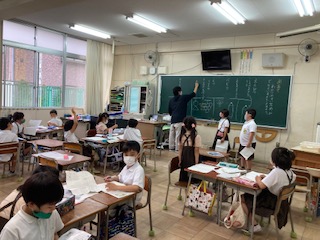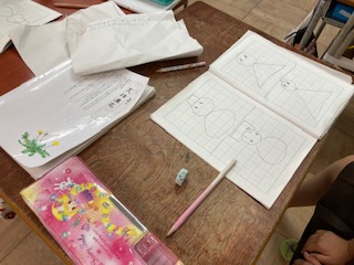 丸や三角などを使って簡単な絵をかきます。友達の説明を聞いて、その通りかいていきます。説明の仕方をどうしたらうまく伝わるか考えて、発表しました。説明によって同じ絵でも少し違った絵になることが分かりました。どんな形をどこにかくか説明しないといけないことが分かりました。