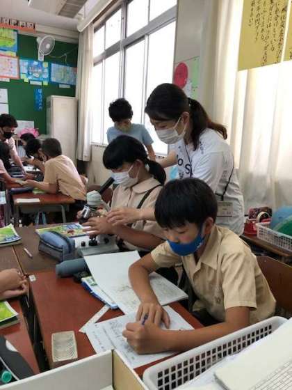 顕微鏡の使い方や部分の名称を確認したあと、グループで実際にプレパラートを観察しました。低い倍率のレンズから観察することが大事だとわかりました。
