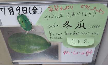 今日は、さけのつけ焼き、みそ汁、とうがんの煮もの、ご飯、牛乳でした。冬瓜は夏に採れて冬まで保存ができることから、この漢字がつけられました。夏のビタミンたっぷりの水分補給に良い食材です。初めて食べたという1年生もいましたよ。