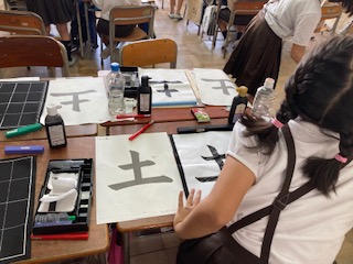 3回目の書写の時間です。「土」という文字を練習しました。姿勢や筆の持ち方などに注意して、止めるところを意識して書きました。