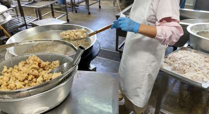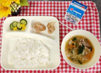今日は鶏肉のから揚げ、中華みそスープ、きゅうりとコーンの甘酢あえ、ご飯、牛乳でした。から揚げは子ども達の人気メニューです。揚げたてを用意してくれました。野菜をたくさん入れた中華スープはみそを入れてコクと風味を増しています。夏休みも野菜をたくさん食べて暑さから体を守りましょう。