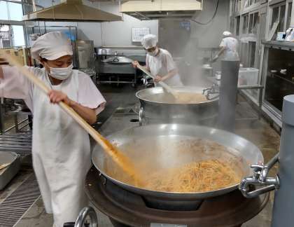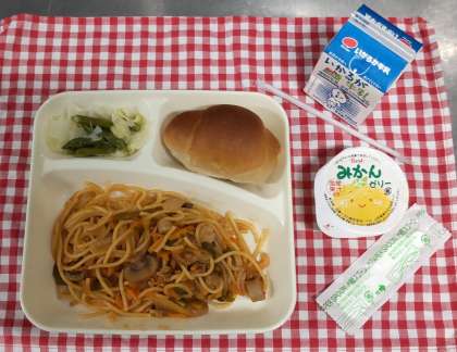 今日はイタリアンスパゲッティ、グリーンアスパラガスとキャベツのサラダ、みかんゼリー、ミニ黒糖パン、牛乳でした。学校のスパゲッティは具だくさんです。1食で100グラム以上の野菜が摂れるように考えられています。