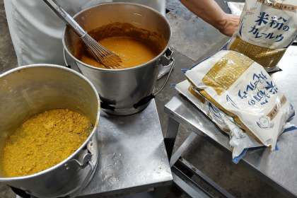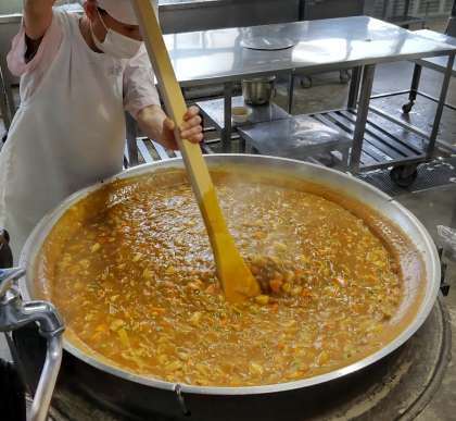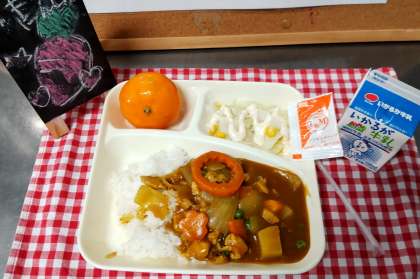 今月は食物アレルギー対応月間です。今日のチキンカレーライスのルウには米粉を使っています。キャベツとコーンのサラダにかけてもらうドレッシングは卵を使用していないマヨネーズ風のノンエッグドレッシングです。これに冷凍みかんを組み合わせています。