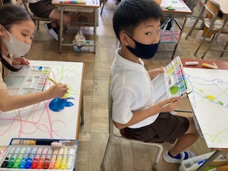 両手で描いた絵に絵の具で着色をしています。