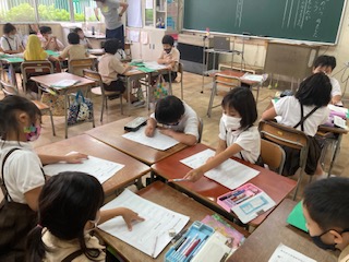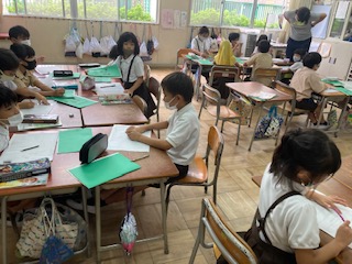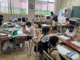 1学期の「サツマイモの育て方」の発展学習として、自分が育てた野菜の育て方についてまとめていきます。育てる時の注意などを思い出し、一年生にわかりやすく教えます。同じ野菜ごとにグループを作り、育て方や収穫の時のことを思い出しながら表にまとめていきました。