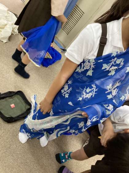 今日は、インドの日常で使用されているサリーや生活雑貨に触れたり、色々な国の挨拶の仕方を学習したりしました。