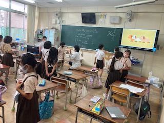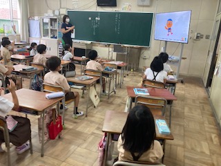 「しあわせなら手をたたこう」の歌を英語で歌ったり、友達とあいさつをしたりしました。