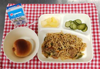 今日は焼きそば、きゅうりのしょうがじょうゆづけ、パインアップルの缶詰、ミニ黒糖パン、牛乳でした。学校の焼きそばは具だくさんで子どもたちにも大人気です。
