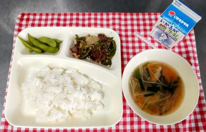 今日は、韓国朝鮮料理のプルコギとトックに今が旬の枝豆を組み合わせました。野菜と一緒に味付けした焼き肉風のプルコギと米粉の餅のトックが入ったスープは好評でした。