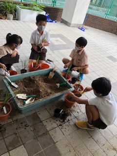 菖蒲の植え替えをしました。6月に去年の株から株分けをし、大きくなったので、鉢に植え替えました。いつもなら区役所や鶴見公園事務所、地域の皆さんに教えていただくのですが、今年は担任の先生の説明を聞いて植え替えをしました。