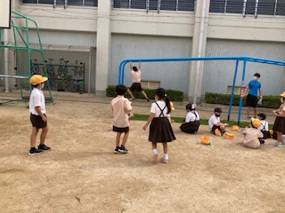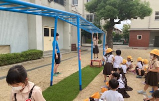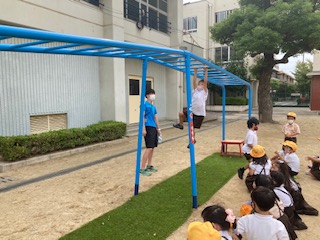 先日、うんていを運動場に設置しました。子どもたちはたくさん手にマメを作りながらも練習しています。
