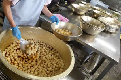 今日は9月21日の十五夜に向けて月見の行事献立を用意しました。中秋の名月ともいわれるこの日には真んまるい月に似た食物をお供えしたり食べたりします。給食でも丸いものを取り入れた、一口がんもとさといものみそ煮、牛肉と野菜のいためもの、みたらしだんごが登場しました。