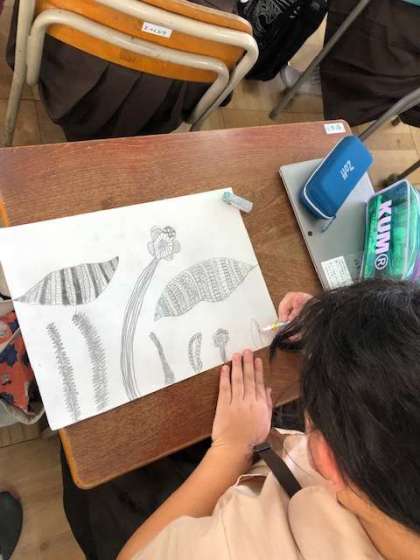 ゼンタングルの技法を取り入れながらジャングルの下絵を描いています。
