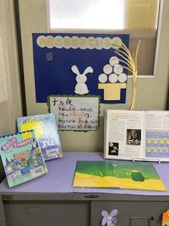 十五夜に関する絵本や図鑑が並んでいます。お月見ができるといいですね。