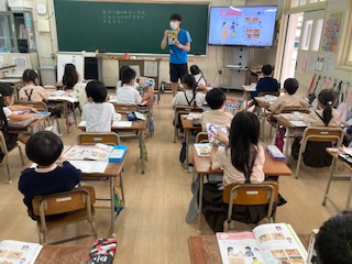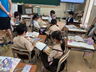 昨日は、一枚の紙の縦と横の長さの比べ方について考えました。紙を折って調べたら良いことが分かったのですが、今日は、折ることができない分厚い本の縦と横の長さの比べ方について考えました。友達に自分の考えを伝えています。