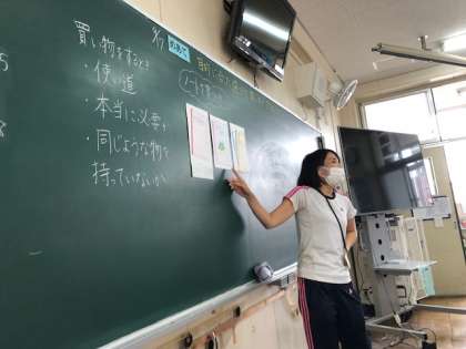 目的にあった買い物の仕方について、ペアで交流したりみんなで話し合ったりしました。