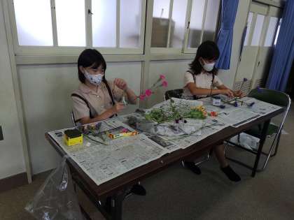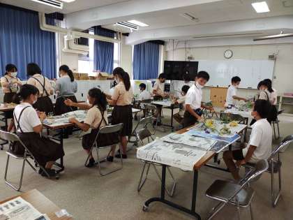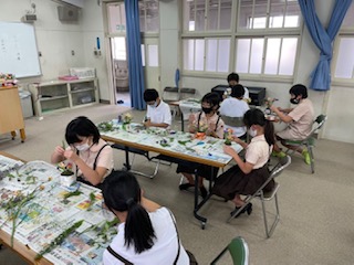 6年生は、地域の生花の先生に、生花の心とアレンジメントを教えていただいています。今年は、花材の準備だけをお願いしました。