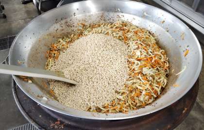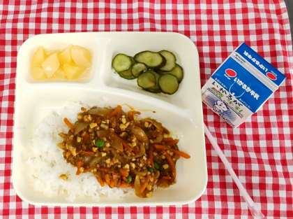 今日は大豆入りキーマカレーライス、きゅうりのピクルス、白桃(缶詰)、牛乳でした。キーマとは、インドの言葉で細かいものを意味し、挽き肉を使っています。小麦粉の代わりに米粉を使って小麦アレルギーにも対応しています。挽き肉とあわせて入れた大豆(ひき割り)の食感が良いと好評でした。