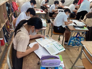 食糧生産についての課題を知り、資料を見ながらまとめています。自分たちの身近な生活の中でも問題発見ができるといいですね。